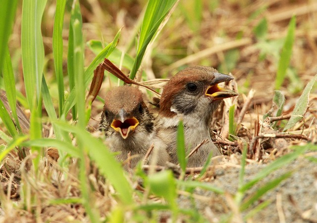 撮影者:青野 宏 エサをねだって親の後を付いて飛び回っていたヒナたちですが、疲れて座り込んでしました。暑さと疲れでハアハアです。 |
