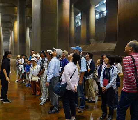 | [内容]春日部市にある首都圏外郭放水路の見学会に総勢18名で参加した。龍Q館で放水路の概要の説明を受けた後、地下神殿に向かった。 500トンの柱が59本もあり、神殿を思わせる壮大な光景であった。 春日部駅の近くで昼食をとった後、日光道中粕壁宿の史跡を散策した。松尾芭蕉が奥の細道の途中に一泊したといわれている東陽寺も参拝した。 郷土資料館では、学芸員の方に、粕壁宿のジオラマで江戸時代の宿場町について解説してもらった。「ぷらっとかすかべ」では、お茶をいただき、休みをとったり、桐たんす等の特産物を見物した。 天候にも恵まれて、春日部の観光を一日楽しんだ。 |