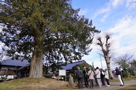 | [内容] 天王台駅から出発して、柴崎、天王台北の神社仏閣、旧跡を散策した。 柴崎神社は、鎮守の森となっており、境内にある皇太子殿下、雅子妃殿下御結婚記念樹、明治天皇遥拝碑、神武天皇石碑、日露戦役黒髪塚等を見物した。 隣接する円福寺では、右手に鯖を持った鯖大師像や落葉したセンダンの大木を見物した。東源寺では、県の天然記念物で樹齢およそ260年のマガヤの古木を見物した。 幹回り4.5m、高さ24mの大木である。薬師如来がある本堂の前で集合写真を撮った。北新田ハケの道では、斜面林の野鳥を観察しながら歩いた。 旧柴崎村名主川村邸では、四足門を見物した。このあたりの風景は旧水戸街道の面影が残っていた。天王台北近隣センターでトイレ休憩をした後、天王台駅にもどった。 歩行距離 約3km |